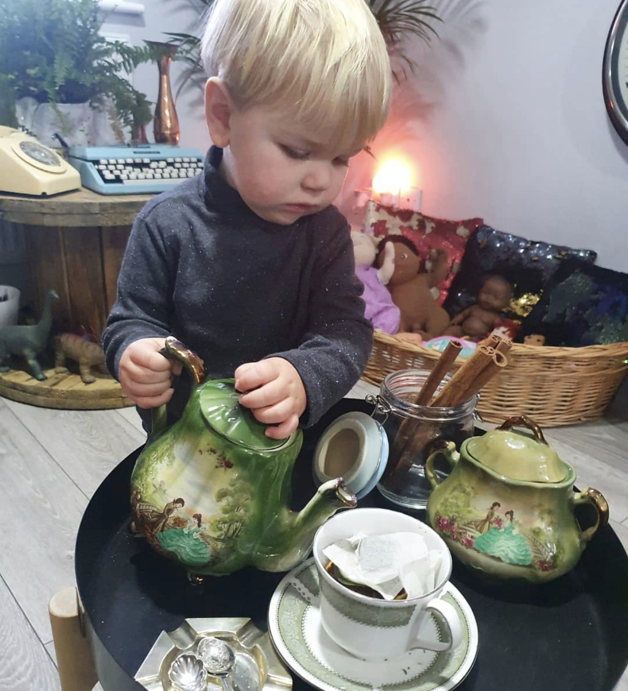 Whilst pouring pretend tea, grinding tea bags and generally being imaginative, we had conversations about the tea pot, cups and saucers. Looking at the differences between the plastic items and the ceramic/real ones. We modelled how to handle each item. How to place items gently on the table. We supported children, those quality teaching and learning moments.