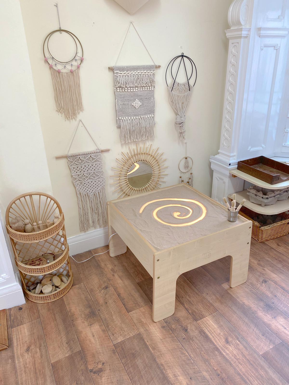 So our ‘sand atelier or indoor ‘Zen garden’ was created, a space to aid & ease transition. A place to soothe an anxious child. A room in which