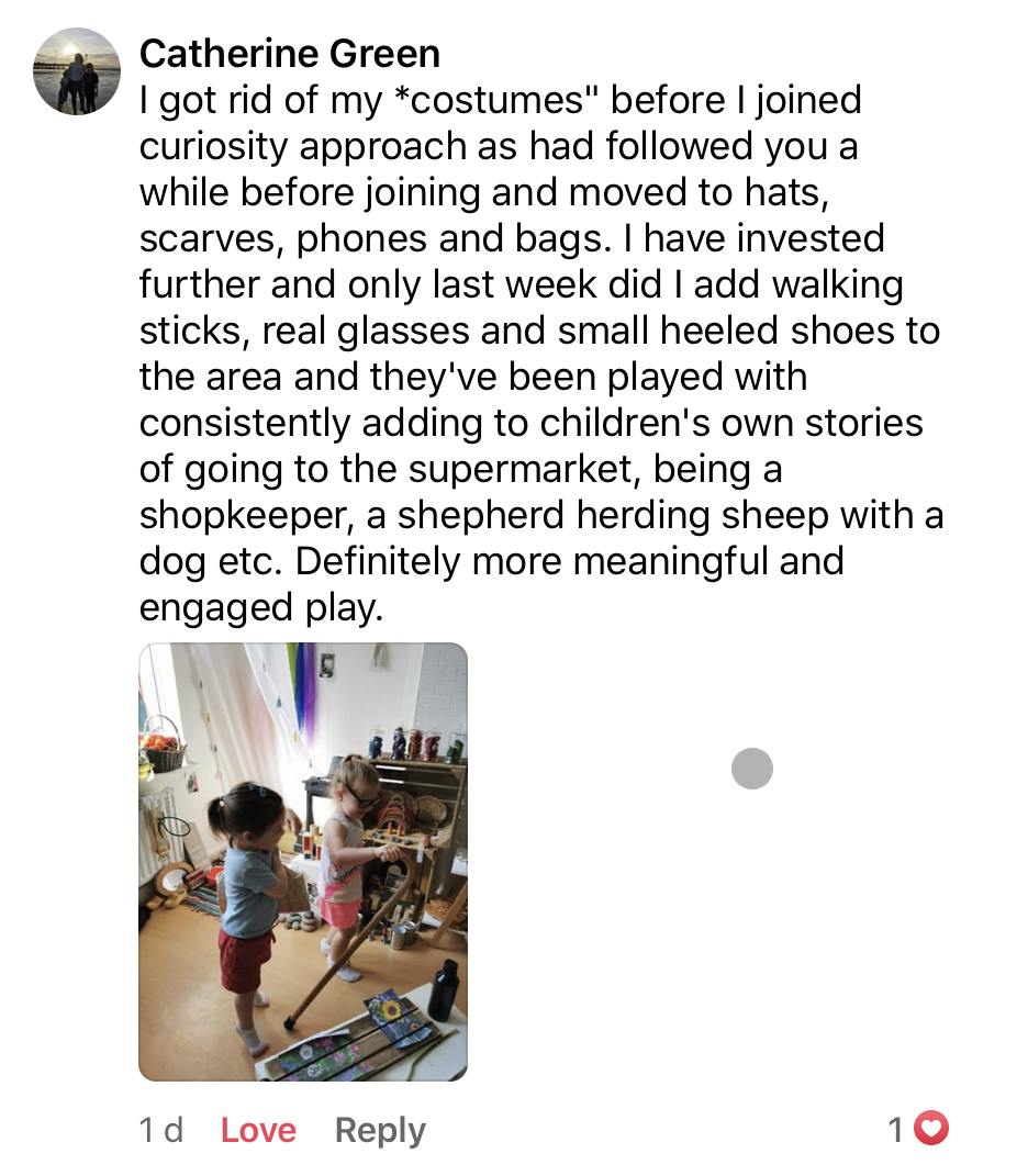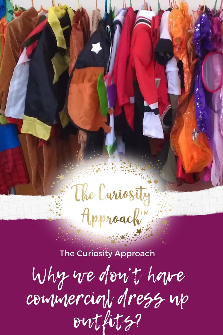 At The Curiosity Approach® we have mindfully & consciously moved away from commercialised dressing up clothes and have replaced items with authentic clothing, hats and scarves and numerous open-ended resources.